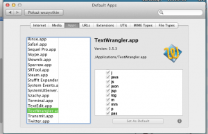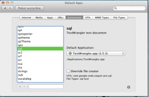 Mnie jednak nie do końca to odpowiadało. Zainstalowałem program TextWrangler i nie uśmiechało mi się otwieranie każdego pliku, klikanie prawym, informacje, otwieraj w, wybranie programu, zaznaczenie że zawsze ma otwierać i zatwierdzanie. I musiałbym to powtarzać dla .php .css .js .sql i wielu wielu innych obsługiwanych przez ten program plików.